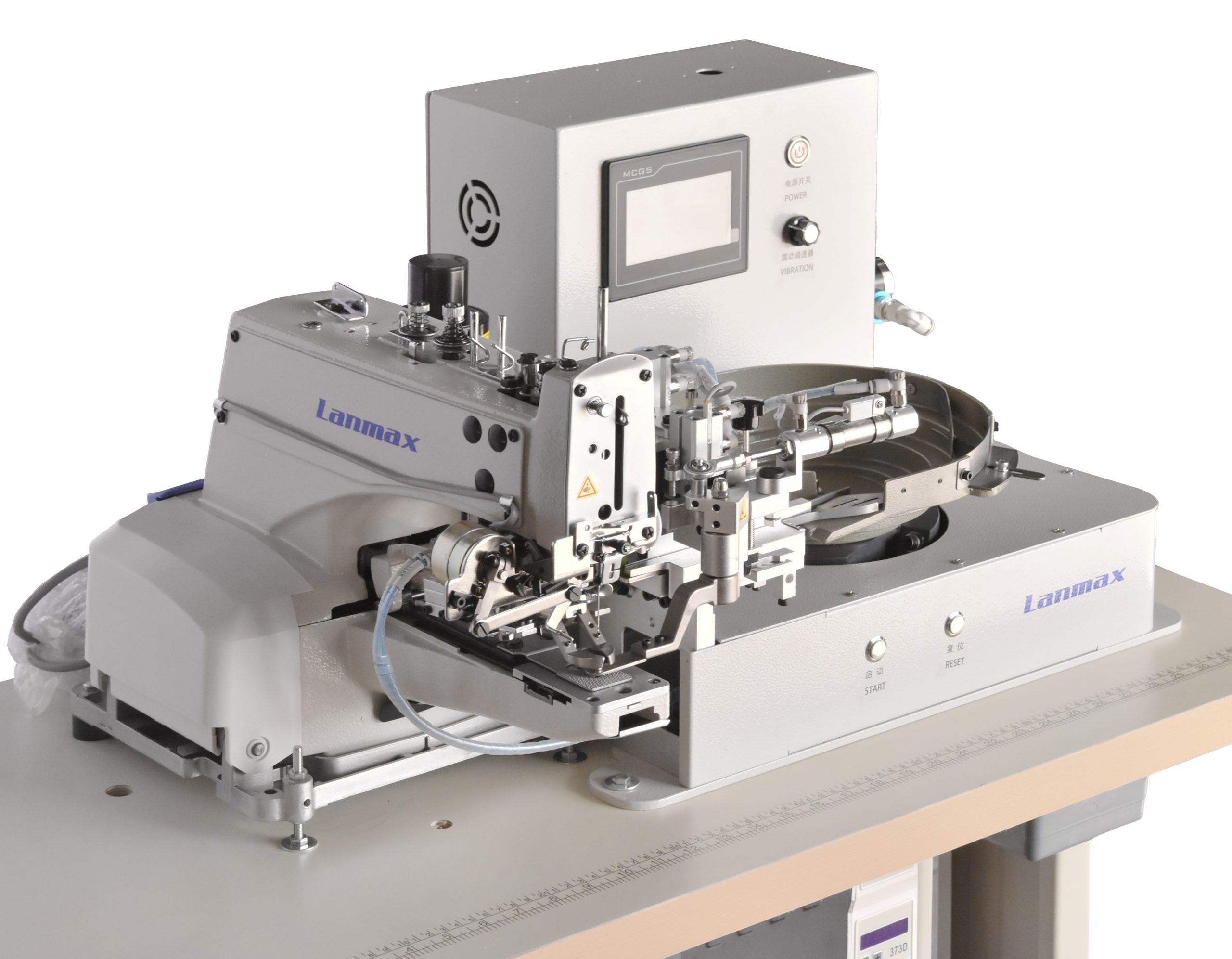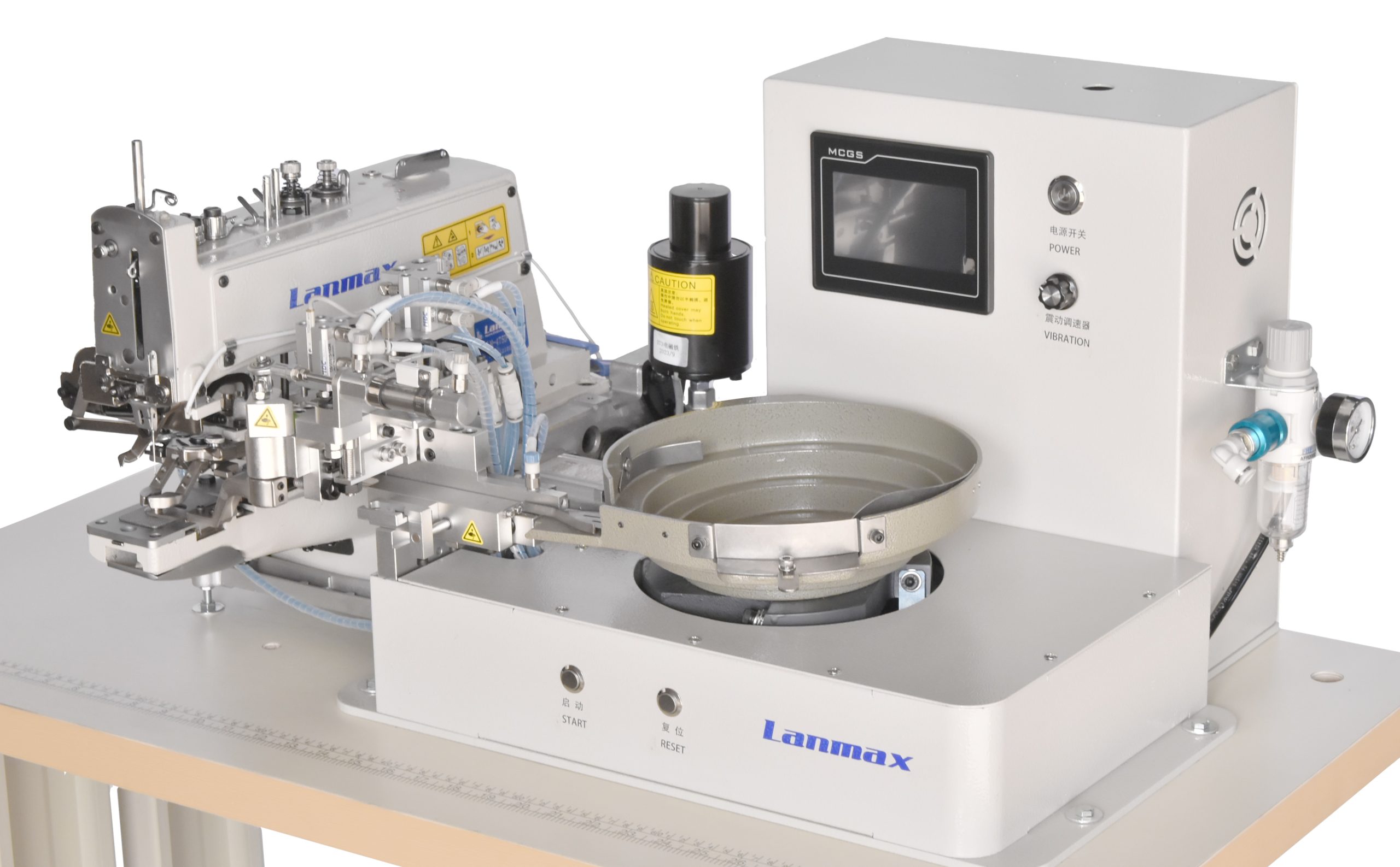 Alimentador de botões automático que transporta e prega centenas de botões deitados por sistema de vibração, de maneira rápida e sem interferência do operador .