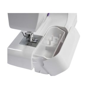 A máquina possui um dispositivo que facilita a passagem da linha na agulha, economizando tempo e evitando frustrações.