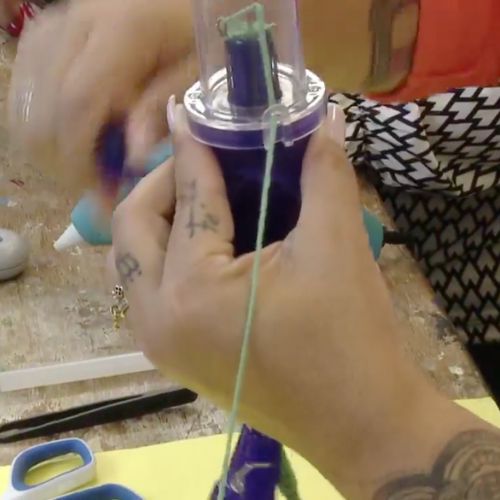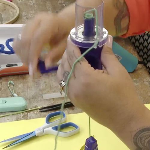 24. Passe o arame pelo meio do trabalho trançado no Tricotin.
