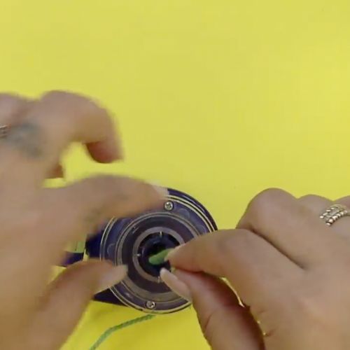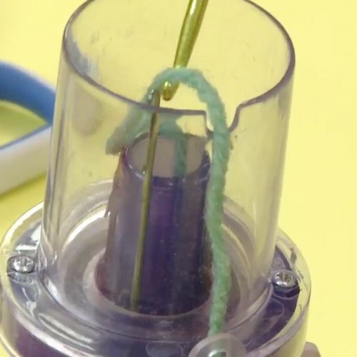 07. O fio ficará encaixado na terceira agulha. Gire novamente a manivela.