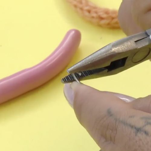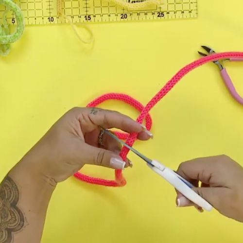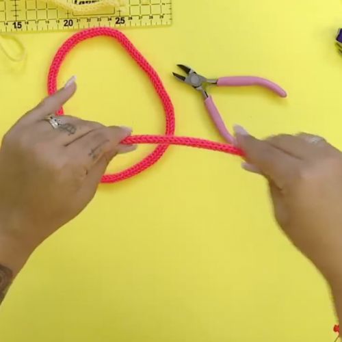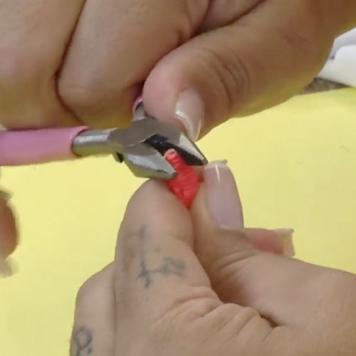 29. Corte um pedaço de arame com o alicate e vire as pontas para não desfiar o cordão.