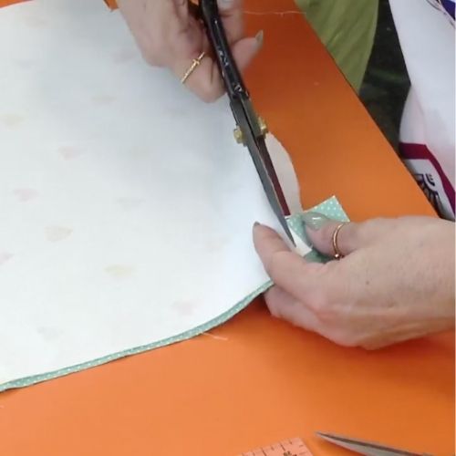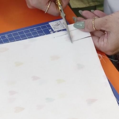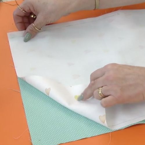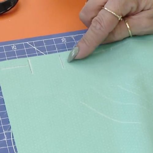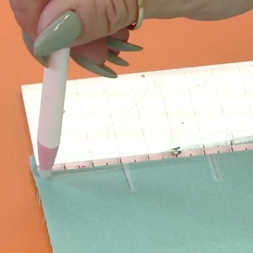 25. Vire o tecido de forro no avesso. Marque 1 cm nas laterais, utilizando a caneta com apagador.