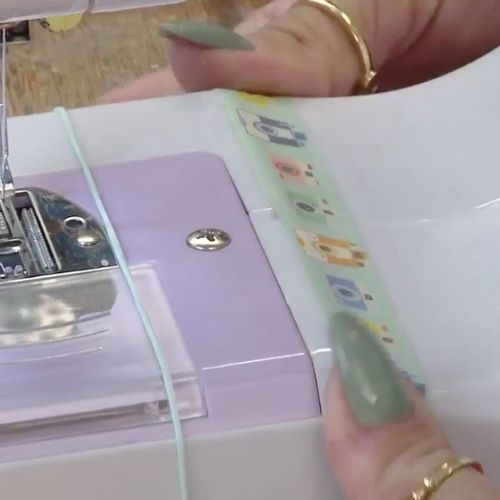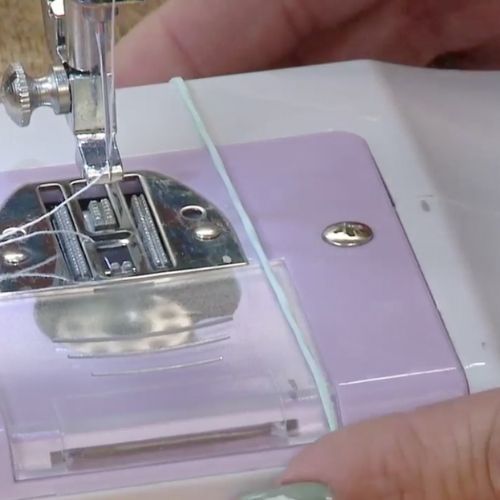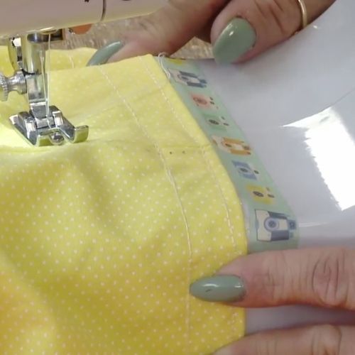 50. Em seguida, alinhe a borda do tecido à primeira marcação de 5cm da máquina e passe uma costura em toda a volta, ajustando a máquina na velocidade 2.