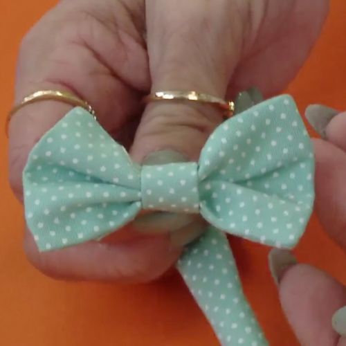 05. Dobre uma tira de tecido e passe no centro do laço para dar acabamento. Corte o excesso e costure.